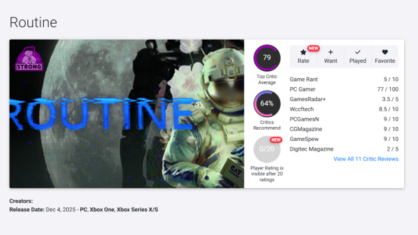Майже 15 років троє завзятих британців зі студії Lunar Software працювали над науково-фантастичним горором ROUTINE і ось нарешті допрацювали. Критики західних видань розділилися на два лагеря, на OpenCritic оцінка склала 79 балів на основі 11 оглядів.