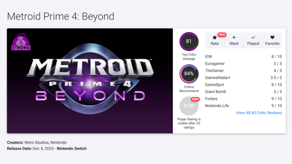 Після 8 років з анонсу та цілих 18 років з моменту випуски останньої номерної частини серії ми врешті-решт незабаром отримаємо до своїх рук Metroid Prime 4: Beyond. Зате західні видання вже встигли пройти настільки довгоочікуваний реліз. На OpenCritic оцінка склала 81 бали на основі 43 оглядів, коли на Metacritic — 80 балів та 74 оглядів.