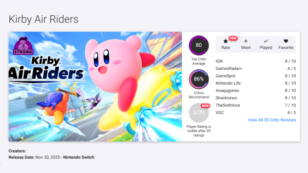 Вже завтра виходитиме перезапуск картинґу 20-річної давнини Kirby Air Riders, який 35 західних оглядачів вже встигли оцінити на 80 балів на агрегаторі OpenСritic, де 86% рецензентів радять гру до купівлі.