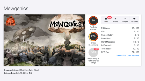 Відомий ґеймдизайнер Едмунд МакМіллен, який подарував світу The Binding of Isaac, ось-ось випустить новий роуґлайк під назвою Mewgenics, що вже встигли розхвалити західні рецензенти. На OpenCritic і Metacritic середня оцінка 90 балів на базі 29 та 31 огляду відповідно та гра вже стала найвище оціненим релізом 2026 року.