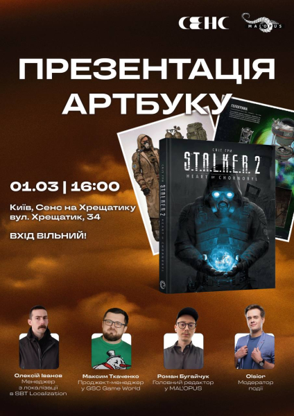 Видавництво MAL’OPUS запрошує на презентацію артбуку «Світ гри S.T.A.L.K.E.R. 2: Heart of Chornobyl». Подія відбудеться 1 березня, о 16.00. Місцем проведення стане Сенс на Хрещатику.